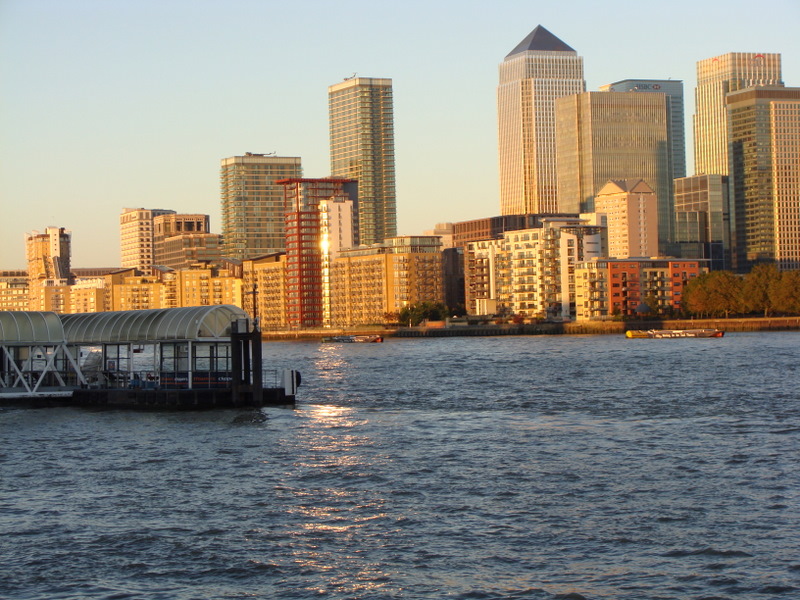 The Thames at sunset, with Canary Wharf on the far side of the river.